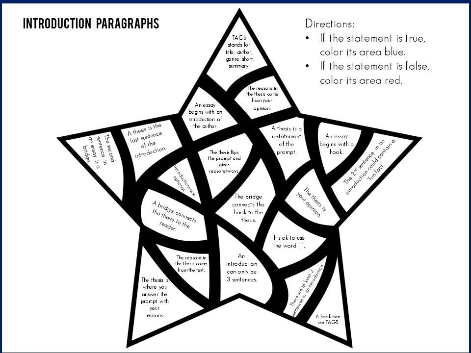 Students will have to determine if each statement is true or false and color it according to directions. All statements are focused on what kind of information is required to be included in the paragraphs of a text-based essay.